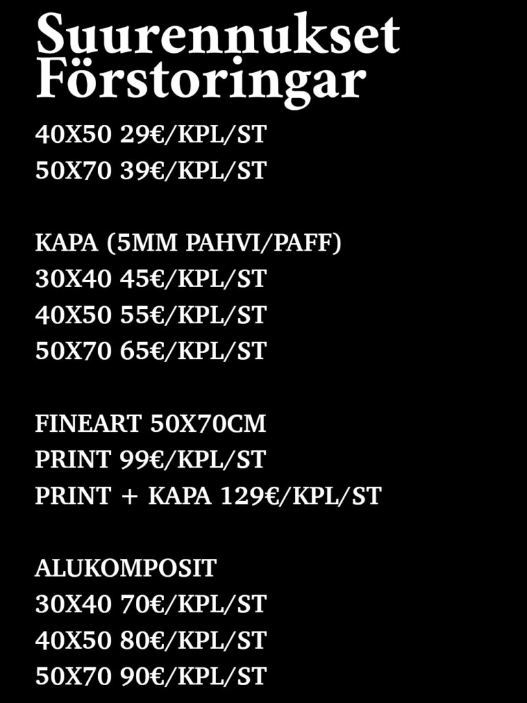 For prints bigger than 30x40cm we use HAHNEMÜHLE PHOTO PEARL -paper. It gurantees a professional quality and finnish.
